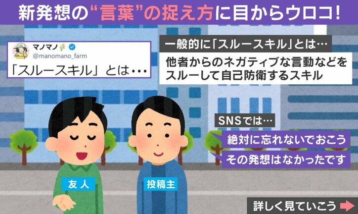 「冷たいイメージがあるけど…」一度受け取ってゴミ箱にポイ! スルースキルの新解釈が話題 わたしとニュース 2026/01/29 12:00 拡大する “スルースキル”の新しい捉え方が、SNSで話題を集めている。 投稿したのは、マノマノさん(@manomano_farm)。友人から聞いた「スルースキル」に関する新しい考え方について、Xに投稿した。友人によると、「“スルースキル”とは、無視をするのではなく、『ありがとうございます』と受け取り、ゴミ箱に捨てること。」だという。これに対し投稿者は「無視って、なんだか冷たいイメージがあるけど『ありがとうございます』って一回受け取って、ちゃんとゴミ箱にポイできたら、なんかそれって大人の余裕って感じする」と感じたそうだ。 続きを読む