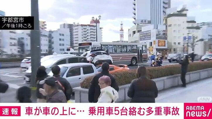 車が車の上に…乗用車5台絡む多重事故 速報 2026/01/30 15:02 【映像】車が車の上に乗っている現場(実際の映像) この記事の写真をみる(2枚) 宇都宮市で乗用車複数台が絡む事故がありました。1人がけがをしたという情報もあります。【映像】車が車の上に乗っている現場(実際の映像) 午後0時30分ごろ宇都宮駅西口近くで「乗用車多数の交通事故、車が車の上に乗っている」などの119番通報がありました。 消防などによりますと乗用車5台が絡む事故で、車には合わせて13人が乗っていたということです。今のところ1人がけがをしたとみられますが、重傷の人はいないということです。 現場は宇都宮駅の西口に近い場所です。(ANNニュース) この記事の画像一覧 【映像】軽トラックが突っ込み8歳女児死亡 運転手の現在 【画像】16歳だった元舞妓が飲酒させられている様子(複数カット) 「避妊できない」結婚11年で6人産んだかおりさん(40) この記事の写真をみる(2枚) Twitter