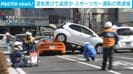 警察によりますと、この事故でタクシーの乗客の女性が首の痛みを訴えて病院に搬送されました。
