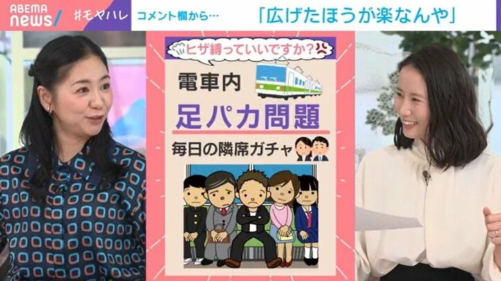 「広げたほうが楽なんや」「ほとんどが無意識」電車の迷惑行為“足パカ”に対するコメントに関根麻里が解決策を提案「電車内でトレーニング動画を流せば良い」 わたしとニュース 2026/02/01 17:00 拡大する タレントの関根麻里がニュース番組『わたしとニュース』に出演。視聴者からのコメントに対し、解決案を提案した。 番組ではこの日、電車など公共の場で足を大きく広げ、周囲のスペースを占領する“足パカ”問題を取り上げた。 これを受けて、視聴者からは「広げたほうが楽なんや」「ほとんどが無意識」というコメントが寄せられた。 これを聞いた関根は、「わかります。(足を)ぴったりくっつけるのは疲れる。内転筋を鍛えると思って、電車内でトレーニング動画を流せば良い。『それでは(両足を)くっつけてみましょう!』みたいな。それを短いスパンで流せばいい。BGMもアゲアゲ系にして。電車フィットネスいいんじゃないか」として、トレーニングにすることで足を意識的に閉じさせるよう提案。 続きを読む