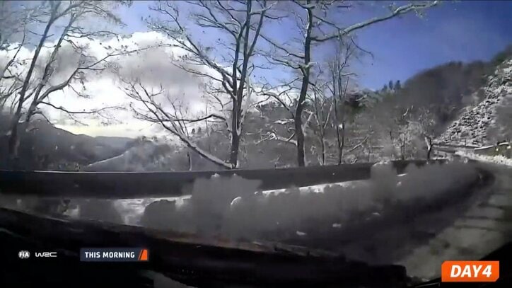 実は、フォード・Mスポーツのジョシュ・マッカリーンが同様の場所でガードレールに接触する場面があったが、こちらは左前を大きく損傷させている。わずかな差が明暗を分ける、今大会の紙一重の難しさを象徴するシーンでもあった。