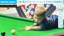 まだ2歳のジュードくんだが、その腕前は、他の球をクッションに当てて狙う「バンクショット」に、1回のショットで2個の球をポケットに入れる「ダブルポット」も見事成功させている。