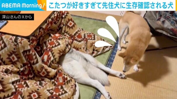 こたつが好きすぎるシベリアンハスキー、柴犬に生存確認されるも「いや、生存確認よりもまず寝相やろw」「頭隠して尻隠さず過ぎる」 ABEMA Morningどうぶつ 2026/02/03 08:00 拡大する こたつが好きすぎるシベリアンハスキー。柴犬に生存確認される様子が、SNSでは話題となっている。 シベリアンハスキーのアシリちゃん(3歳)は、ずっと“エアこたつ”で冬をしのいでいきた。しかし、ついに本物のこたつの季節を迎えた。散歩から帰って、ごはんの前の時間。完成したこたつに向かって、ためらいなく、すぽんと頭から潜って、お気に入りの“ぬくぬくポジション” へ。 すると…そばにいる柴犬のリンちゃん(5歳)が、そっと覗きに来る。「アシリ、大丈夫?」そんなふうに、生存確認をするのも、冬のあいさつみたいなもの。こたつの中でぬくぬく満足しているアシリちゃんと、静かに寄り添うリンちゃん。冬の部屋に流れる、小さな幸せの時間だ。(@miyamafukayama) 続きを読む