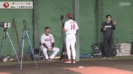 投手でブルペン一番乗りとなった前田のグラブに、三木監督がポーンと勢いよくボールを預ける。少し会話をかわすと、その後三木監督は前田のすぐ後ろのパイプ椅子に腰掛け、投球の様子を見守っていた。