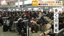 改札にできた長い行列。待合席にも多くの乗客の姿があります。