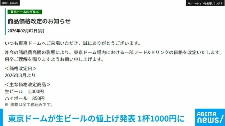 東京ドームが生ビールの値上げを発表 1杯1000円に 速報 2026/02/03 12:33 【映像】商品価格改定のお知らせ(東京ドームのホームページ) 東京ドームがホームページを更新しました。【映像】商品価格改定のお知らせ(東京ドームのホームページ) 「東京ドーム内グルメ 商品価格改定のお知らせ 昨今の諸経費高騰の影響により、 東京ドーム場内における一部フード&ドリンクの価格を改定いたします。何卒ご理解を賜りますようお願い申し上げます。 <価格改定日>2026年3月より <主な価格改定商品>生ビール 1000円 ハイボール 850円 ※価格は全て税込みです」 (『ABEMA NEWS』より) 【映像】時価750万円で売られる超高額ポケモンカード 【画像】「なんで私?」イーロン・マスクに見つかり世界的にバズった佐保里さん 借金1000万円肩代わり “ホス狂い”の娘を持つミドリさん Twitter