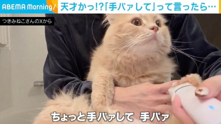 飼い主「手パァにして」→猫の“驚きの行動”に「さすがに天才すぎるだろ」「確実に理解してる!」など大絶賛の声 ABEMA Morningどうぶつ 2026/02/04 08:00 拡大する 「手パァにして」とお願いしたら…“驚きの行動”をする猫に、SNSでは大絶賛の声があがっている。 甘えん坊な性格のラガマフィンのつきみくん(3歳)。肉球の間から伸びた毛をバリカンでお手入れ。飼い主(@____tukimineko)から「ちょっと手パァにして」と言われると…手をパーにしてカットしやすくしてくれた。これには飼い主も「天才かと思った」と驚愕。人間の言葉を理解しているのか。素直にパーしてくれる姿が可愛すぎる。 続きを読む