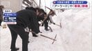 誘導しているのは、道路沿いの会社に勤める人たちです。車がいない隙を狙って一斉に硬くなった雪をつるはしで取り除いていきます。