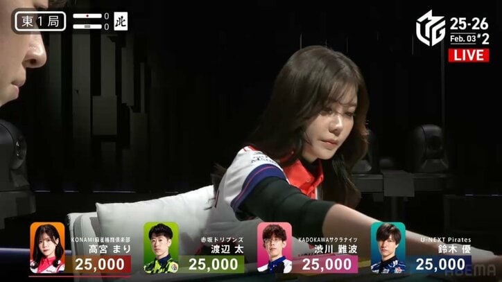 人気美女雀士、あわや自爆の危機…大事な牌をリリースしかけた冷や汗場面 見ていた人々も「さすがにびっくりしたw」「天然高宮」/麻雀・Mリーグ Mリーグ 2026/02/04 12:00 拡大する 「大和証券Mリーグ2025-26」、2月3日の第1試合でKONAMI麻雀格闘倶楽部の高宮まり(連盟)が、自身の親番で守り神とも言える重要な牌を危うく手放しかけ、視聴者が騒然となる一幕があった。 場面は東1局、高宮の親番で訪れた。配牌から白の暗刻、さらにダブ東となる東の対子があるというチャンス手。赤5索もあり高打点が狙えるという中、4巡目に3枚目の東を引き、ダブ東が完成した。ところが高宮の手が事もあろうに引いたばかりの東へと伸びた。 続きを読む