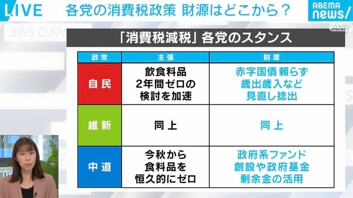 財務省担当記者「消費税減税のメリットばかりが強調されているが、デメリットはあまり説明されていない」…“経済”から見る衆院選 ニュース解説 2026/02/04 11:30 拡大する 2月8日に投開票される衆院選を前に選挙活動は白熱。各党が様々な経済政策を掲げているが、実現した場合、我々の生活にどのように影響するのか? テレビ朝日経済部財務省担当の佐藤美妃記者に聞いた。 各党の消費税の政策・スタンスは以下のようになっている。自民党と日本維新の会「飲食料品2年間ゼロ検討」 中道改革連合「食料品恒久的ゼロ」 国民民主党「一律時限的5%」 日本共産党「一律5%、その後廃止」 れいわ新選組「廃止」 減税日本・ゆうこく連合「廃止を含めた抜本改正」 参政党「段階的廃止」 日本保守党「食料品恒久的ゼロ」 社民党「ゼロ」 チームみらい「税率維持、社会保険料の負担減」 続きを読む
