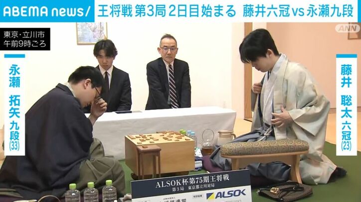 王将戦第3局2日目始まる 藤井六冠vs永瀬九段 速報 2026/02/04 11:11 拡大する 5連覇を目指す藤井聡太六冠(23)に永瀬拓矢九段(33)が挑戦する将棋の王将戦第3局の2日目が始まりました。勝敗は夕方以降に決まる見通しです。 王将戦七番勝負第3局の2日目は、東京・立川市の「オーベルジュときと」で、永瀬九段が封じた55手目が開封され、午前9時に始まりました。 王将戦の持ち時間はそれぞれ8時間ですが、残りは藤井六冠がおよそ3時間40分、永瀬九段はおよそ5時間で、永瀬九段が多く残しています。 続きを読む
