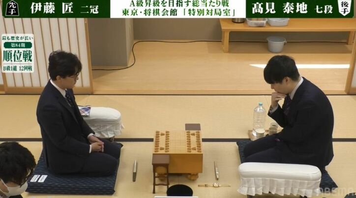 伊藤匠二冠、A級昇級へ前進なるか!残留目指す高見泰地七段と譲れぬ一戦 白星手にするのはどっちだ/将棋・順位戦B級1組 将棋伊藤匠 2026/02/05 12:02 拡大する 将棋の第84期順位戦B級1組12回戦が2月5日に行われ、伊藤匠二冠(叡王、王座、23)と高見泰地七段(32)が東京・千駄ケ谷の「東京将棋会館」で午前10時に対局を開始した。 「鬼の住処」とも呼ばれ、毎年過酷な昇級・残留争いが繰り広げられるB級1組には、全13名の棋士が所属。伊藤二冠は今期初参戦となったが、これまでに10戦を終えて8勝2敗の2位につけている。3月5日に予定されている最終局を含めたあと2戦は、初のA級昇級に向けて絶対に落とせない重要対局となる。 続きを読む