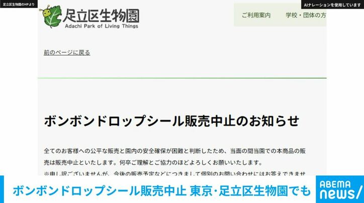 ボンボンドロップシール販売中止 東京・足立区生物園でも 速報 2026/02/05 19:05 拡大する 東京の足立区生物園の発表です。ボンボンドロップシール販売中止のお知らせ全てのお客様への公平な販売と園内の安全確保が困難と判断したため、 当面の間当園での本商品の販売は販売中止といたします。 何卒ご理解とご協力のほどよろしくお願いいたします。 ※申し訳ございませんが、 今後の販売予定などにつきまして個別のお問い合わせにはお答えできません。(『ABEMA NEWS』より) 続きを読む
