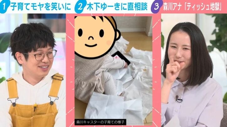 「ティッシュを永遠に出される…」森川夕貴キャスターの子育てあるあるの悩みに木下ゆーきが「スマホだけでできる」“今日からできる”対処法を伝授 わたしとニュース 2026/02/09 12:30 拡大する 子育て中の“あるある”ともいえる「子どもがティッシュを永遠に取り出す…」「触ってほしくない物を触ってしまう…」などの悩み。ニュース番組『わたしとニュース』の森川夕貴キャスターが子育ての赤裸々な悩みを、子育てインフルエンサー・木下ゆーきに“生相談”した。 続きを読む