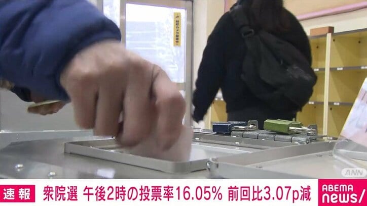 午後2時現在の全国の投票率は16.05%で、前回の衆院選と比べて3.07ポイント減少しています。特に、鳥取・島根の山陰地方が10ポイント以上も前回に比べ減っています。