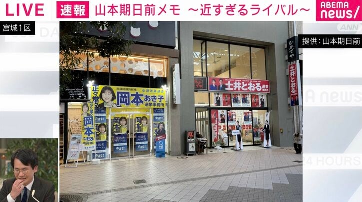 山本氏が注目したのは、ライバル同士である土井氏と岡本氏の選挙事務所が「ちょうど隣同士」という異例の配置になった点だ。急遽決まった解散のため、人通りの多い空きテナントを急いで探した結果、偶然隣り合わせになったという。山本氏によると、通常であれば公示までに調整するが、今回は「変える時間もない」ことから、お互いに「今回はしょうがないよね」と挨拶を交わして設営されたという。