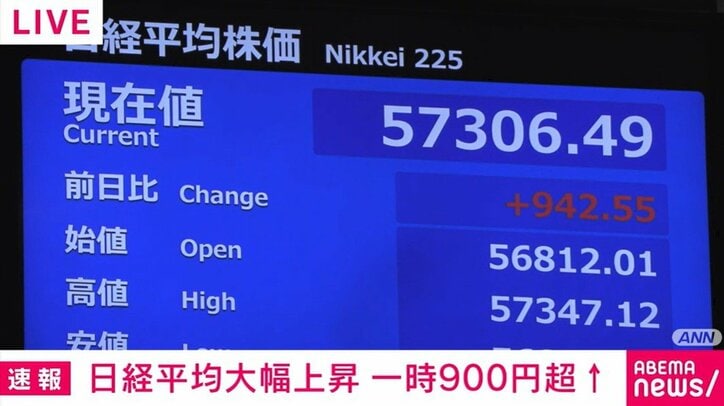 きのう史上最高値をつけた日経平均は、きょうも取引開始直後から上昇しています。きのうの終値、5万6363円から取引開始直後に900円以上値上がりしました。