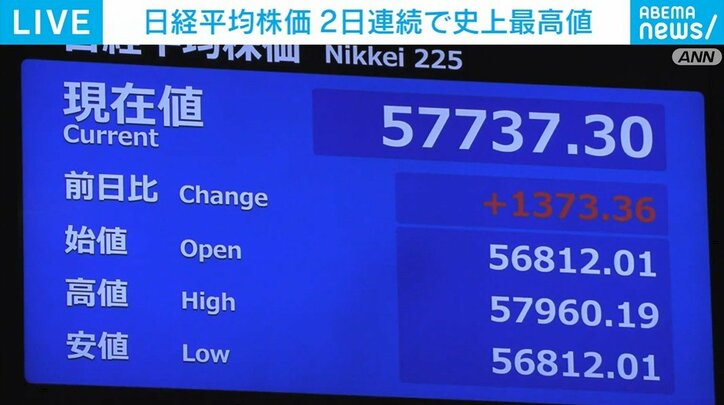 きのう史上最高値をつけた日経平均は、取引開始直後から大きく値を上げました。一時、1500円以上値上がりし、きのうつけた取引時間中の最高値5万7337円を上回りました。