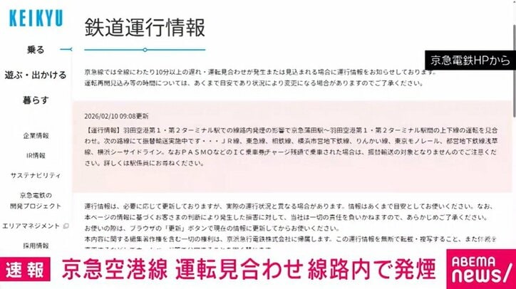 京急空港線 運転見合わせ 線路内で発煙 速報 2026/02/10 10:48 【映像】京急電鉄のホームページ 警視庁によりますと、午前9時10分、京浜急行の羽田空港第1・第2ターミナル駅で「線路から火が出ている」と消防に通報がありました。【映像】京急電鉄のホームページ 駅員が消火活動をして火は消し止められたということです。 この影響で、京急の空港線は京急蒲田駅と羽田空港第1・第2ターミナル駅の間の上下線で運転を見合わせましたが、午前9時50分に運転を再開しました。(ANNニュース) 【映像】林家ペー、火事で全焼した自宅へ「貯金はほとんどない」 激しく立ち上る黒煙と炎…郵便局のバイクなど28台が燃える火事 「火災は兵器によるもの」…災害時のデマに騙されない方法は? Twitter