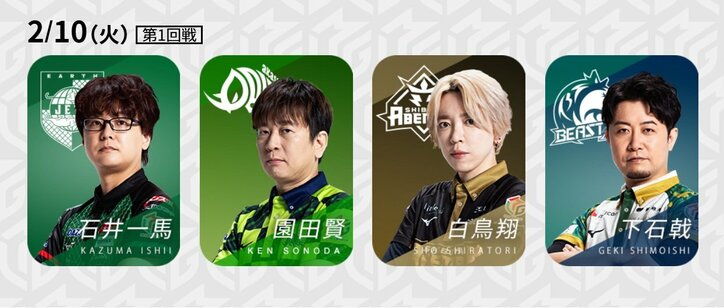 玄人好みの実力派対決 勝敗を分けるのは捌きか覚悟か、それとも指運か/麻雀・Mリーグ Mリーグ 2026/02/10 18:30 拡大する Mリーグ機構は「大和証券Mリーグ2025-26」、2月10日の第1試合に出場する4選手を発表した。リーグ戦も残り4分の1に差し掛かり、各チームは順位を強く意識しながらの戦いに突入している。そんな中、第1試合の卓組みはMリーグでも屈指の実力を誇る選手がずらり。玄人好みの技や読みの応酬に期待がかかる。 EARTH JETS・石井一馬(最高位戦)、BEAST X・下石戟(協会)というリーグ1年目から大活躍している2人は、開幕前から評判は戦った。それだけに、このぐらいの活躍は選手たちからすれば想定内だったかもしれない。ただし、赤坂ドリブンズ・園田賢(最高位戦)、渋谷ABEMAS・白鳥翔(連盟)と、リーグ初年度から引っ張ってきた存在からすれば、黙ってはいられないところ。リーグ順位もさることながら、純粋のこの強者4人の組み合わせで、どんな麻雀が展開されるかは麻雀好きであるほど楽しみでたまらない。 続きを読む