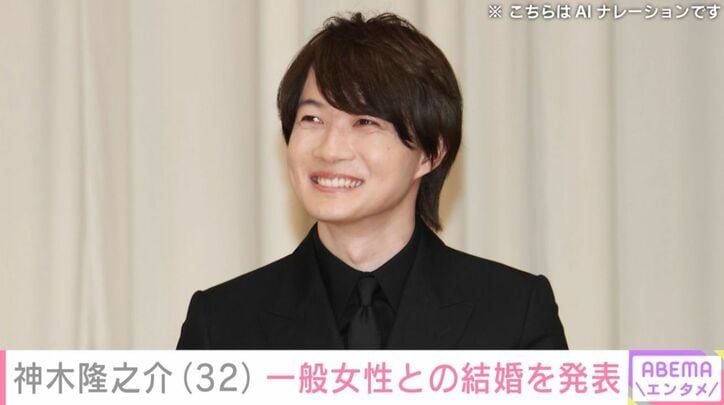 神木隆之介(32)、一般女性との結婚を発表 速報,ABEMAエンタメ神木隆之介 2026/02/10 21:43 拡大する 俳優の神木隆之介(32)が、結婚したことを発表しました。 神木の所属事務所は10日、公式サイトで、「この度、神木隆之介が結婚したことをご報告させていただきます。なお、お相手は一般の方となりますので、取材等はお控えいただきますと幸いです」とコメントしています。 神木は、1995年、2歳の時にCM出演で芸能界デビュー。1999年に、ドラマ「グッドニュース」で初のレギュラー出演をして以降、子役から、大人の俳優へと活躍の場を広げていきました。 続きを読む