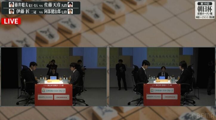 第19回朝日杯将棋オープン戦準決勝が2月11日、大阪府高槻市の「高槻城公園芸術文化劇場」で行われ、午前10時10分から藤井聡太竜王・名人(王位、棋聖、棋王、王将、23)―佐藤天彦九段(38)、伊藤匠二冠(叡王、王座、23)―阿部健治郎七段(36)の対局が始まった。