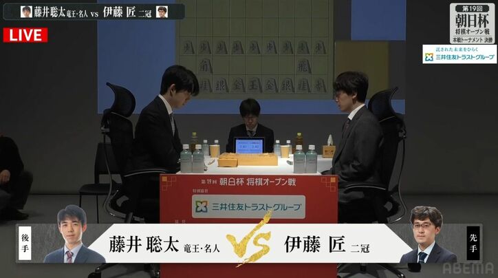 藤井聡太竜王・名人、3年ぶり最多5度目Vなるか!伊藤匠二冠の初優勝か!注目の朝日杯決勝戦始まる 将棋藤井聡太,伊藤匠 2026/02/11 17:53 拡大する 将棋の藤井聡太竜王・名人(王位、棋聖、棋王、王将、23)と伊藤匠二冠(叡王、王座、23)が2月11日、第19回朝日杯将棋オープン戦決勝戦で激突。大阪府高槻市の「高槻城公園芸術文化劇場」を舞台に、午後2時15分から対局を開始した。振り駒の結果、先手番は伊藤二冠に決定した。 藤井竜王・名人は、午前中に行われた準決勝で佐藤天彦九段(38)に勝利。3年ぶり、歴代最多タイとなる5度目の優勝を目指している。一方、伊藤二冠は初の決勝進出。午前の準決勝では阿部健治郎七段(36)に勝利した。 続きを読む