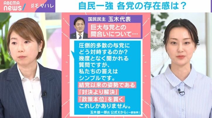 このラブコールとも取れる発言に対し、国民民主党の玉木雄一郎代表は「圧倒的多数の与党にどう対峙するのか。答えはシンプル。結党以来の姿勢である『対決より解決』『政策本位を貫く』これしかありません」と答えている。