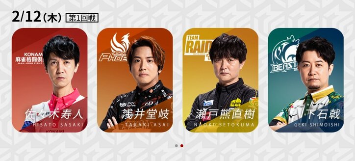 プラスポイントは減らしたくない!2~5位、上位陣の直接対決/麻雀・Mリーグ Mリーグ 2026/02/12 19:00 拡大する Mリーグ機構は「大和証券Mリーグ2025-26」、2月12日の第1試合に出場する4選手を発表した。この卓ではリーグ上位にいる2~5位の4チームが集結。レギュレーション突破に向けて、少しでもポイントを維持したいという思いが強くなる戦いだ。 10チーム中、上位6チームがレギュレーションを突破する中、上位5チームまでがプラスポイント。ひとまずシーズン中をプラスで終えさえすれば、第一関門はクリアできるという様相になっている。首位はEX風林火山が独走中。少しでも差は詰めておきたいところだが、まずは残り30試合を来たシーズンを、無事に走り切るかが重要だ。 続きを読む