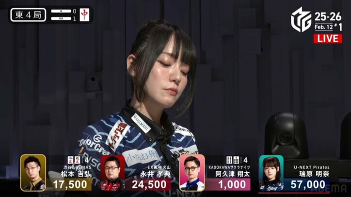 清楚系美麗ママ雀士のギャップがたまらない「この表情たまらんな」「上から明奈きた」珍しい“悩み顔”に反響/麻雀・Mリーグ Mリーグ 2026/02/13 11:00 拡大する 愛くるしい笑顔を振りまくママ雀士のギャップがたまらない!「大和証券Mリーグ2025-26」、2月12日の第1試合。U-NEXT Pirates・瑞原明奈(最高位戦)が、対局中に見せた一瞬の表情に注目が集まる場面があった。 東4局1本場、瑞原は5万7000点持ちのトップ目という盤石の態勢。さらにリードを広げるべく親番での連荘を狙うが、配牌はピンズで1メンツと、形にするにはやや時間がかかりそうな手格好だった。 続きを読む