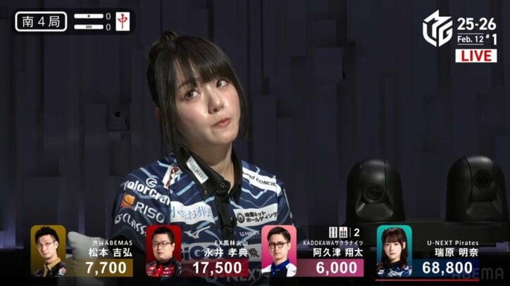 ライバルをものすごい見てる…カメラに抜かれる度に表情を変える美麗雀士にファン興奮 放送席もその“技”を称賛「一流ってすごい」/麻雀・Mリーグ Mリーグ 2026/02/13 12:00 拡大する コロコロ変わる表情をカメラは逃さなかった。「大和証券Mリーグ2025-26」、2月12日の第1試合。勝利をほぼ手中に収めたオーラスの局面で、U-NEXT Pirates・瑞原明奈(最高位戦)が披露したチャーミングな振る舞いが、視聴者と放送席を大いに沸かせた。 南4局、瑞原は6万8000点という特大の点棒を抱えたダントツのトップ目。あとはこの局をノーテンで静かに終えればトップが確定するという、勝利目前の最終盤だった。18巡目、瑞原が2索を河に置くと、これに下家の渋谷ABEMAS・松本吉弘(協会)が反応。テンパイへの道筋を求めてか、カン2索で鳴くか否かの長考に入った。 続きを読む