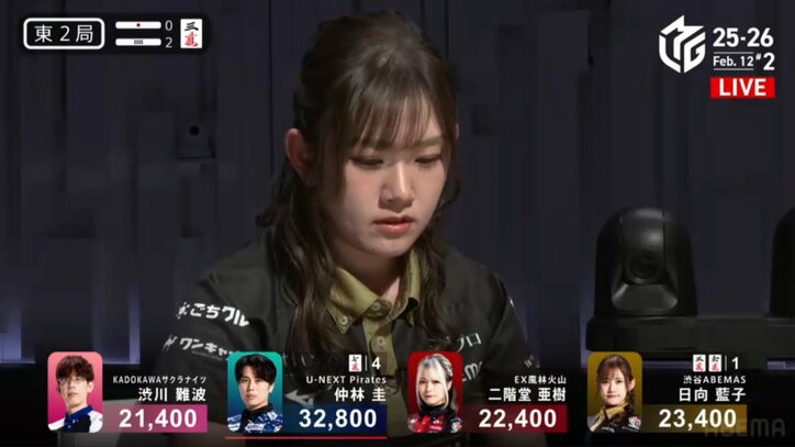 「これ跳満にするのスゴすぎ」日向藍子、最後に引いたドラが“大き過ぎるご褒美”1対4の確率も吹っ飛ばした一局に「でっけ!」/麻雀・Mリーグ Mリーグ 2026/02/13 13:00 拡大する 強烈なアガリに誰もが興奮した。「大和証券Mリーグ2025-26」、2月12日の第2試合で渋谷ABEMAS・日向藍子(最高位戦)が、執念の打ち回しから山に1枚しか残っていないドラを完璧に引き寄せ、放送席とファンを驚愕させた。 東2局2本場、2万3400点持ちの2着目で迎えた日向は、配牌で役牌の中、自風の西が対子、さらにマンズが5枚という好形を手にする。白や北といった字牌の孤立牌もあり、展開次第では混一色も色濃く見える勝負手だった。3巡目に西を暗刻にすると、5巡目に中をポン。さらに6巡目にはドラの三万を引き入れ、一気に打点アップのチャンスを迎えた。 続きを読む