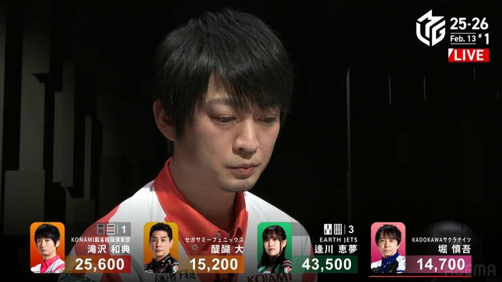 こんな幕切れある?オーラス、跳満直撃条件で生まれた“天国と地獄”案件「なんてこった~」「ミラクルきちゃああ」コメント欄も喜びと悲しみが入り乱れる事態に/麻雀・Mリーグ Mリーグ 2026/02/14 12:00 拡大する こんな逆転劇、そうは見られない。「大和証券Mリーグ2025-26」、2月13日の第1試合、オーラスに待ち受けていたのは、麻雀の神様のいたずらとも思えるあまりに劇的な逆転劇だった。 南4局2本場(供託1000点)、EX風林火山・滝沢和典(連盟)は2万5600点持ちの2着目。トップ目を走るEARTH JETS・逢川恵夢(協会)は4万3500点を持っており、滝沢が逆転するには逢川からの跳満直撃、あるいは倍満ツモという極めて厳しい条件が課せられていた。 続きを読む
