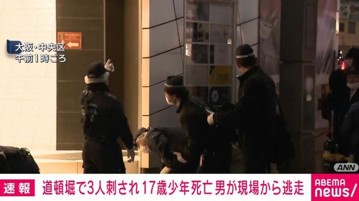 大阪・ミナミの道頓堀で、若い男性3人が男に次々と刃物で刺され、17歳の少年が死亡しました。男は現在も逃走中です。