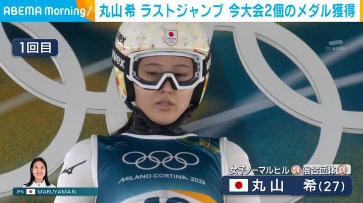 丸山希 ラストジャンプ 今大会2個のメダル獲得 速報 2026/02/16 08:26 【映像】2つのメダルを獲得した丸山希選手のジャンプ この記事の写真をみる(2枚) 女子スキー・ジャンプでは今大会、最後の種目となるラージヒル、丸山希らがメダルを賭けて挑みました。【映像】2つのメダルを獲得した丸山希選手のジャンプ ここまで2つのメダルを獲得している丸山希。 1回目では、飛距離128メートルのジャンプで7位につけます。 そして、今大会のラストジャンプ。 結果は8位入賞。 丸山の初めてのオリンピックは2つのメダル獲得で締めくくりました。(ANNニュース) この記事の画像一覧 【映像】スノボ男子ビッグエアで決勝進出の荻原大翔選手 女子モーグル冨高日向子、規定に泣き惜しくも4位に フィギュア団体 日本銀メダル 2大会連続 この記事の写真をみる(2枚) Twitter