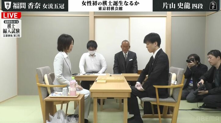福間香奈女流五冠、注目の棋士編入試験第2局!黒星発進から巻き返しなるか 試験官・片山史龍四段と対局開始 将棋 2026/02/16 10:02 拡大する 将棋の福間香奈女流五冠(清麗、女王、女流王座、女流王位、倉敷藤花、33)が挑む棋士編入試験第2局が2月16日、東京・千駄ケ谷の将棋会館で行われ、午前10時に片山史龍四段(21)との対局を開始した。 試験は、若手棋士5人と対戦する五番勝負。3勝を挙げれば合格となるが、福間女流五冠は第1局で山下数毅四段(17)を相手に黒星を喫している。史上初の女性の棋士誕生へ、ここから巻き返しを図ることができるか。本局の先手番は片山四段。 続きを読む