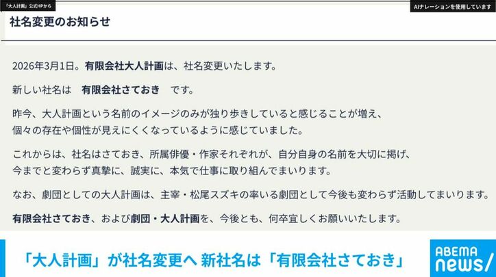 2026年3月1日。 有限会社大人計画は、社名変更いたします。