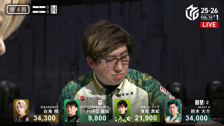 ギューっと掴んでバチン!ブルドーザー雀士、渾身の一撃「これが大介の魅力よ」/麻雀・Mリーグ Mリーグ 2026/02/17 11:00 拡大する 力のこもった指先からバチンと気持ちいい音が響いた。「大和証券Mリーグ2025-26」2月16日の第1試合、南4局でBEAST X・鈴木大介(連盟)が魂を込めた一撃を放ち、劇的な逆転劇を演じた。 試合は混沌を極めていた。南3局、鈴木大介は渋谷ABEMAS・白鳥翔(連盟)に6400点の放銃を喫し、3万4000点の2着目に後退。トップ目の白鳥とはわずか300点差という超接戦で自らの親番を迎えることとなった。 続きを読む
