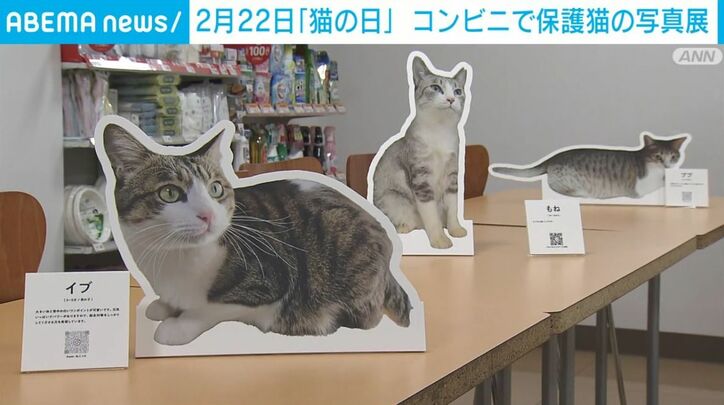2月22日の「猫の日」を前に、飼い主のいない保護猫の写真展が東京・渋谷のコンビニで始まりました。スマートフォンを通して気になる猫を引き取ることもできます。