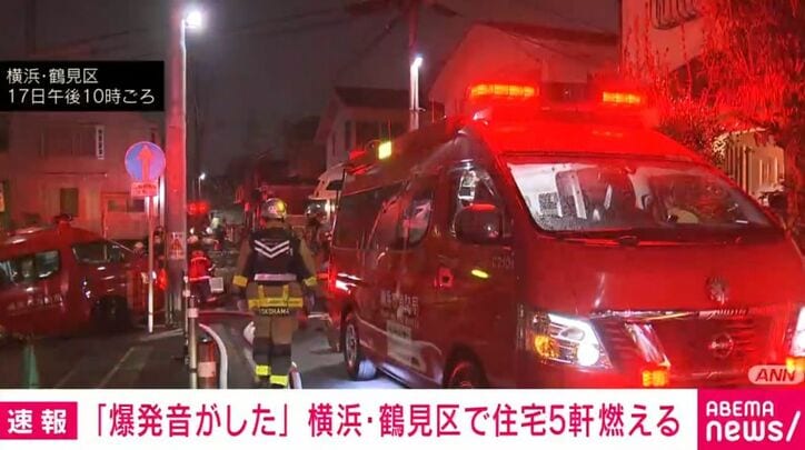 「爆発音がした」横浜・鶴見区で住宅5軒燃える 速報 2026/02/17 23:53 拡大する 横浜市鶴見区の住宅街で火事があり、住宅5軒が焼けました。この火事で80代の男性1人がけがをしています。 午後7時半ごろ、横浜市鶴見区で「住宅から煙が出て爆発音がした」と119番通報がありました。住宅から炎が激しく上がり、燃え広がりました。 ポンプ車など40台以上が出動し、およそ3時間後に火はほぼ消し止められましたが、住宅5軒が焼けました。この火事で80代の男性1人が足にけがをして、病院に搬送されました。 続きを読む