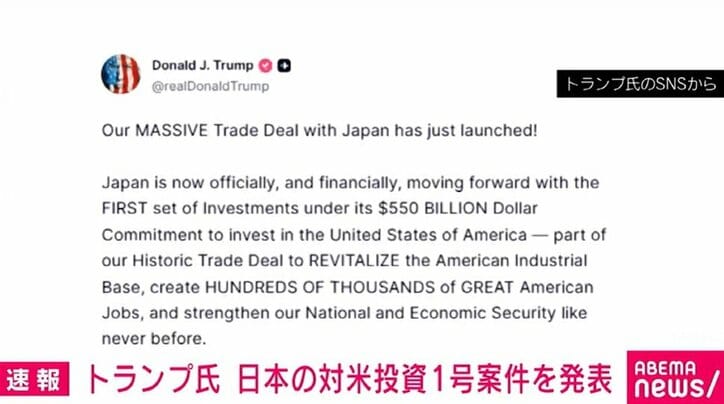 アメリカのトランプ大統領は日本が約束した対米投資について、1号案件となる3つの事業が決定したと発表しました。