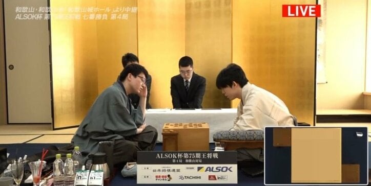 「やりたい構想をぶつけている」和歌山対局は永瀬拓矢九段のペースで進行 藤井聡太王将の終盤戦に注目/将棋・王将戦第4局 将棋藤井聡太,永瀬拓矢 2026/02/18 12:38 拡大する 将棋の藤井聡太王将(竜王、名人、王位、棋聖、棋王、23)に永瀬拓矢九段(33)が挑戦する「囲碁将棋チャンネル ALSOK杯第75期王将戦七番勝負」が2月18日、和歌山市の「和歌山城ホール」で第4局2日目の対局が行われている。注目の一戦は、終盤の入り口に突入しており今後の展開から目が離せない。 藤井王将が追いつくか、永瀬九段が悲願のタイトル奪取に“王手”をかけるか。大注目の中で争われているシリーズ第4戦は、永瀬九段が前日に封じた68手目の開封から再開された。 続きを読む