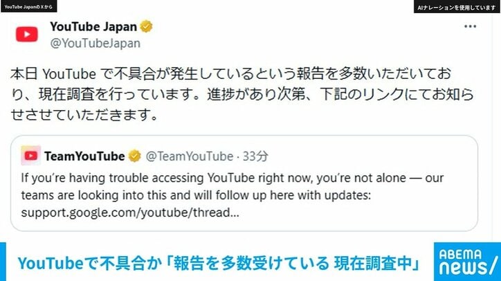 YouTubeで不具合か「報告を多数受けている 現在調査中」 速報 2026/02/18 14:12 【映像】YouTube JapanのX YouTube JapanがXを更新しました。【映像】YouTube JapanのX 「本日YouTubeで不具合が発生しているという報告を多数いただいており、現在調査を行っています。進捗があり次第、下記のリンクにてお知らせさせていただきます」 (『ABEMA NEWS』より) 【映像】時価750万円で売られる超高額ポケモンカード 【画像】「なんで私?」イーロン・マスクに見つかり世界的にバズった佐保里さん 借金1000万円肩代わり “ホス狂い”の娘を持つミドリさん Twitter