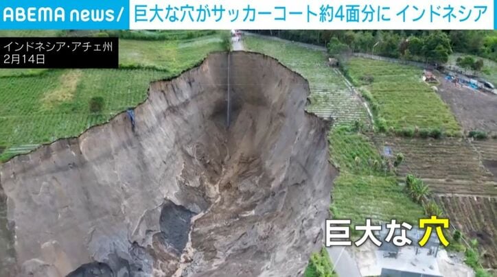 「もう何も植えられない」年々広がる謎の“巨大な穴”…生活脅かす大規模な陥没に地元農家が悲鳴 インドネシア わたしとニュース 2026/02/19 18:00 拡大する まるで地面がごっそりとえぐり取られたかのような、巨大な穴。現地の人からは悲鳴の声が上がっている。 インドネシア・スマトラ島北部のアチェ州にある農村の畑で、大規模な陥没が起きている。 地元当局によると、この穴は今年に入って約3ヘクタール(サッカーコート4面分ほど)に拡大しているという。 この陥没は農家の生活を脅かしていて、陥没によって畑を失った農家は「もう何も植えることができない。政府が補償してくれることを心から願う」と悲鳴を上げている。 続きを読む