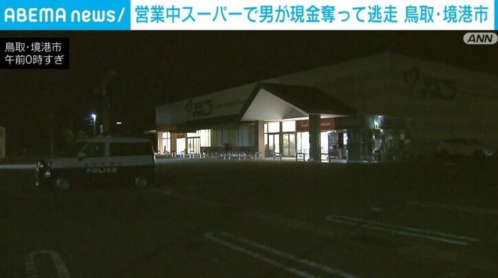 鳥取県境港市の営業中のスーパーに男が押し入り現金を奪って逃走しました。警察は強盗事件として男の行方を追っています。