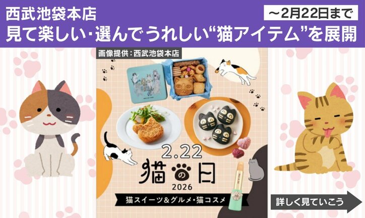 猫アイテム特集が話題「また旅ができるほど元気に」人間用“またたびコーラ”が登場 わたしとニュース 2026/02/21 12:30 拡大する 2月22日の猫の日に合わせ、猫にちなんださまざまな“アイテム”が展開され、話題を集めている。 西武池袋本店では、「見て楽しい・選んで嬉しい“猫アイテム”」を展開。猫をテーマにした猫スイーツでは、リビエールの「ラングドシャ」、メリーチョコレートの「ねこみゃみれ にゃそーてっドチョコレート」、NEKO LABの「オリジナル猫クッキー缶」など、猫のイラストが描かれた可愛い容器に入ったお菓子が販売されている。 続きを読む