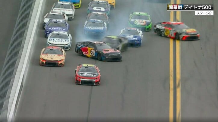 サーキット騒然!デイトナ500で“玉突き事故” 先頭争いで「外、真ん中、内側」相次ぐ連鎖接触に「これは無理」「避けきれない」 NASCAR 2026/02/22 12:30 拡大する 【NASCAR】開幕戦 デイトナ500/日本時間2月16日 アメリカで大人気のレース、NASCAR(ナスカー)の2026年開幕戦にして年間屈指の伝統レース『デイトナ500』が開催。マシン3台が横並びで競い合う“スリーワイド”状態から玉突き状態で今季初の多重クラッシュが起き、サーキットは騒然となった。 レースは中盤、85周が過ぎたところで、先頭集団からマシンが混雑していて3台横並びのまま行列をなしていた。すると、ターン(コーナー)の立ち上がりに入ったところで、4~5番手につけていた外側と中列のマシンが接触。中列のマシンが内側のマシンを弾き飛ばしてしまい、そこから複数台が絡む多重クラッシュが発生してしまう。 続きを読む