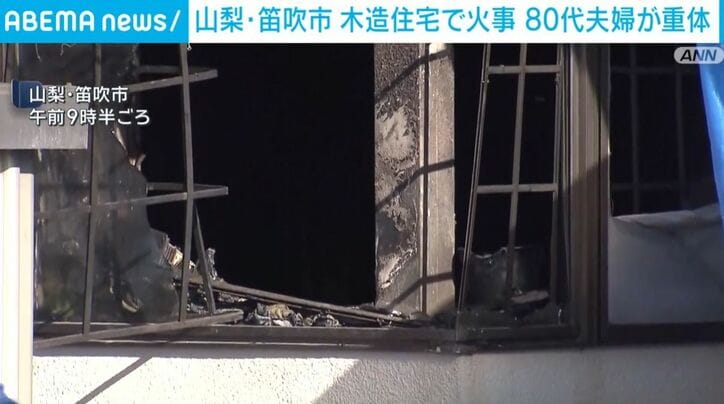 山梨・笛吹市 木造住宅で火事 80代夫婦が重体 速報 2026/02/21 14:31 拡大する 山梨県笛吹市の木造2階建て住宅で火事があり、この家に住む80代の夫婦が意識不明の重体です。 午前1時半すぎ、笛吹市石和町の木造2階建て住宅で「隣の家から火が見える」と近くの住民から通報がありました。 警察と消防によりますと、ポンプ車など4台が出動し、火はおよそ1時間半後に消し止められましたが、1階部分の100平方メートルほどが焼けました。 この火事で、住宅に住む80代の夫婦が意識不明の状態で病院に搬送されています。男性は身体の広い範囲にやけどをしているということです。 続きを読む