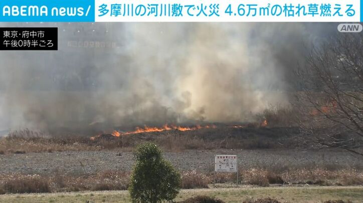 多摩川の河川敷で火災 4.6万平方メートルの枯れ草燃える 速報 2026/02/21 19:33 拡大する 東京・府中市などを流れる多摩川の河川敷で、枯れ草が燃える火事がありました。古谷暁カメラマン実況「多摩川の河川敷で現在火災が発生しており消火活動が行われています」 21日正午ごろ、府中市小柳町付近の多摩川の河川敷で、目撃者から「火と黒煙が見える」などと119番通報が相次ぎました。 警視庁などによりますと、ポンプ車などが出動して消火活動にあたり、火は2時間ほど後にほぼ消し止められましたが、およそ4万6000平方メートルの枯れ草が焼けました。 続きを読む