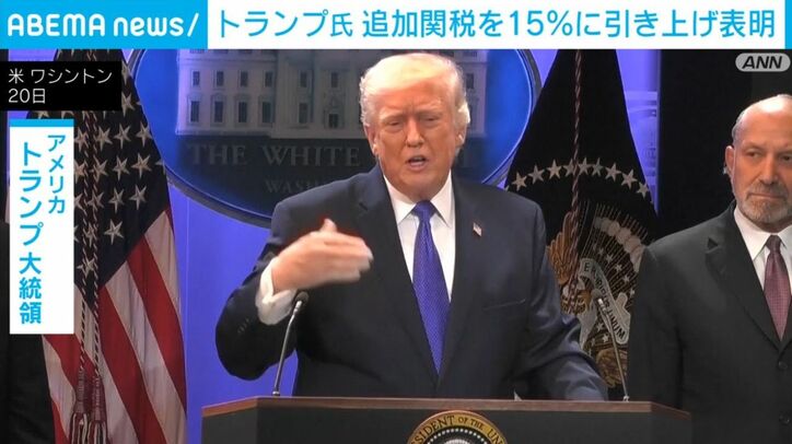 トランプ氏 追加関税を15%に引き上げ表明 速報 2026/02/22 10:31 拡大する アメリカのトランプ大統領は世界各国に課すと表明していた10%の追加関税を15%に引き上げると表明しました。 アメリカの連邦最高裁判所が20日にトランプ政権が発動した「相互関税」などを違法と判断したことを受けて、トランプ政権は「通商法122条」を根拠に、日本を含む世界各国からの輸入品に対し、一律10%の追加関税を24日午前0時1分から発動すると発表しました。 さらにトランプ大統領は21日、自身のSNSにこの10%の追加関税を15%に引き上げると表明しました。いつから15%に引き上げるのかなど、詳細は不明です。 続きを読む